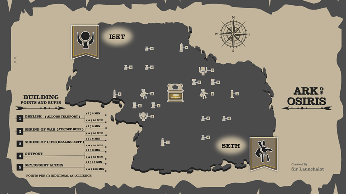 시간마다 맵 중앙에 젠 되는 오시리스의 관은 아군의 건물로 수송하면 역전이 가능한만큼의 포인트를 받는다. 다만 수송하는 부대는 디버프가 있어, 연맹내에서 호위를 잘 해줘야 한다.