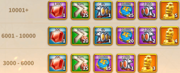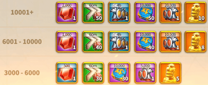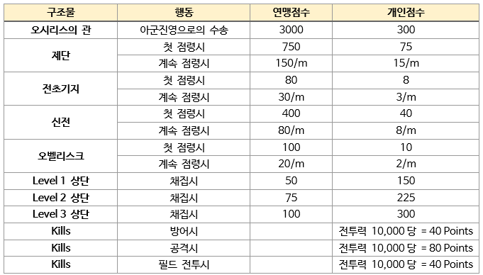 ● 전투에 의한 점수는 적군 전투력 10,000을 제거하는 경우 위의 표와 같이 산정된다. 여기서 중요한 것은 전투에 의한 포인트는 연맹점수를 얻을 수 없다.