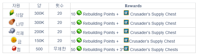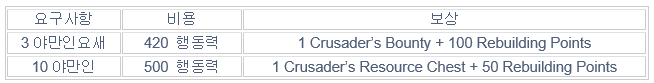 이 이벤트는 성취하기 간단하고 보상이 뛰어나다. 당신이 이 이벤트에 사용할 자원은 비쌀 것이다. 하지만 당신이 얻을 보상은 그만한 가치가 있다. 가능한 한 자주 기부하고, 가능한 한 많은 크루세이더의 보급품을 획득하라. 여러분이 기부할 때마다, 각 상자 안에 있는 보상은 기부할 가치가 충분히 있다.