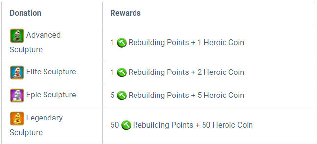 각 조각상을 기부하면, 일정 리빌딩 포인트와 영웅 코인을 획득할 수 있다.