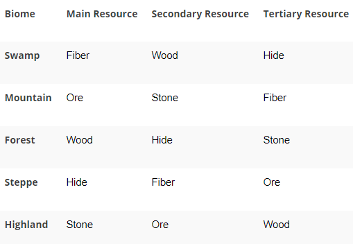모든 자원을 모든 지도에서 찾을 수 있는 것은 아니다. 어떤 바이오메일에 속해 있느냐에 따라 다른 자원에 부딪치게 된다. 늪에서 철이 필요한가? 많은 것을 찾으려면 가까운 산지로 이동하십시오!
