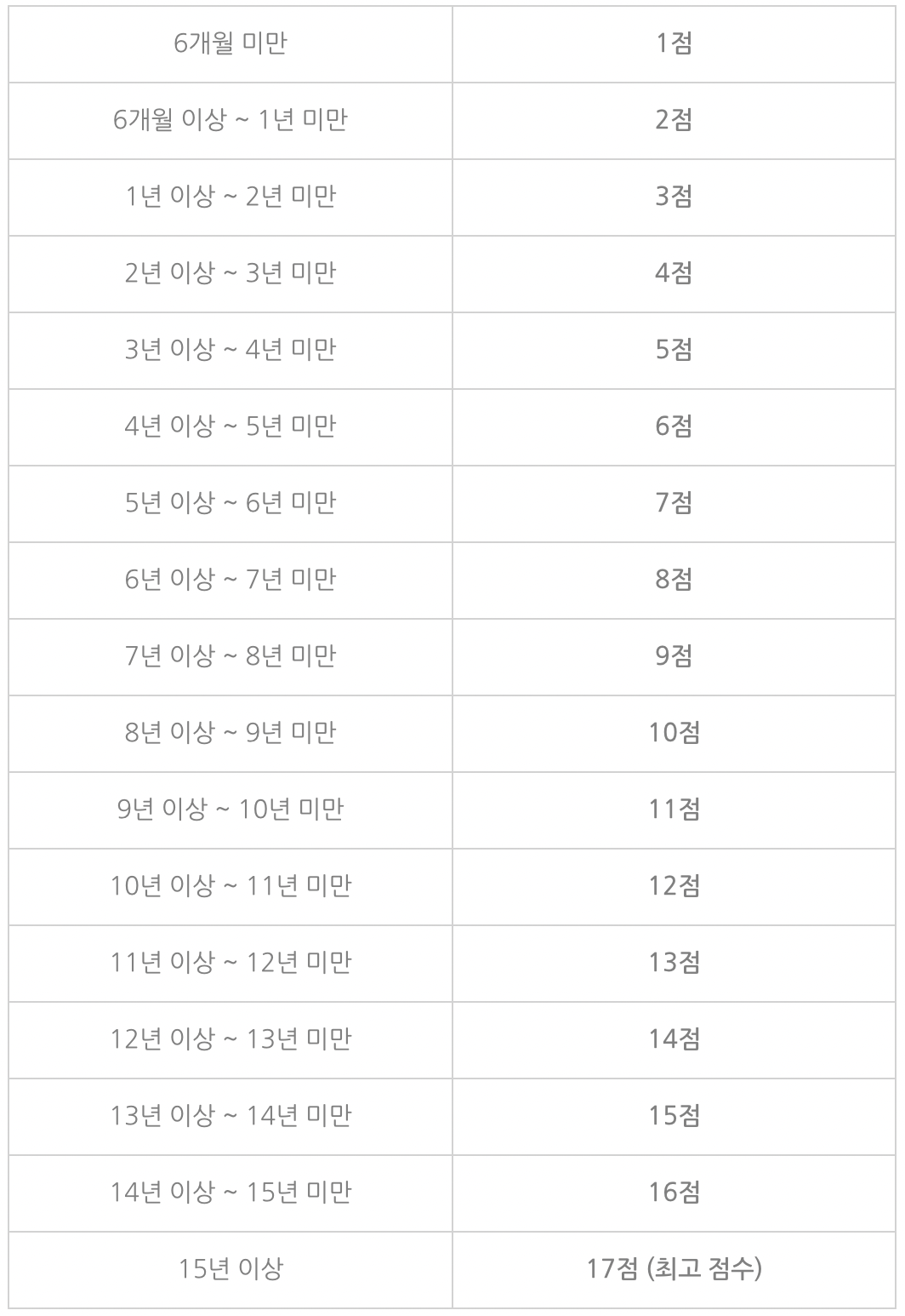 2년 이상부터 1년씩 증가할 때마다 1점씩 늘어납니다.